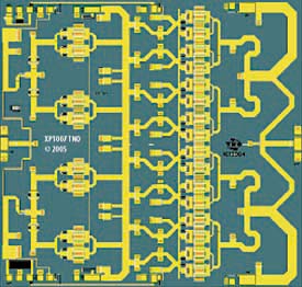 (Figure 6: GaAs MMIC high-power amplifier chip showing intricate transmission line networks and power combining structures.)